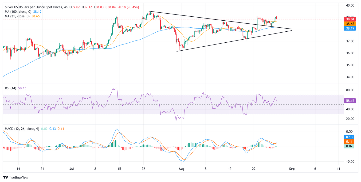 From a technical standpoint, Silver confirmed a bullish breakout above a symmetrical triangle on the 4-hour chart, as price surged past the triangle’s upper boundary and key moving averages. The move follows Wednesday’s successful retest of the breakout zone near $38.00, which held firm thanks to support from the 100-period Simple Moving Average (SMA) and a recovery in bullish momentum.