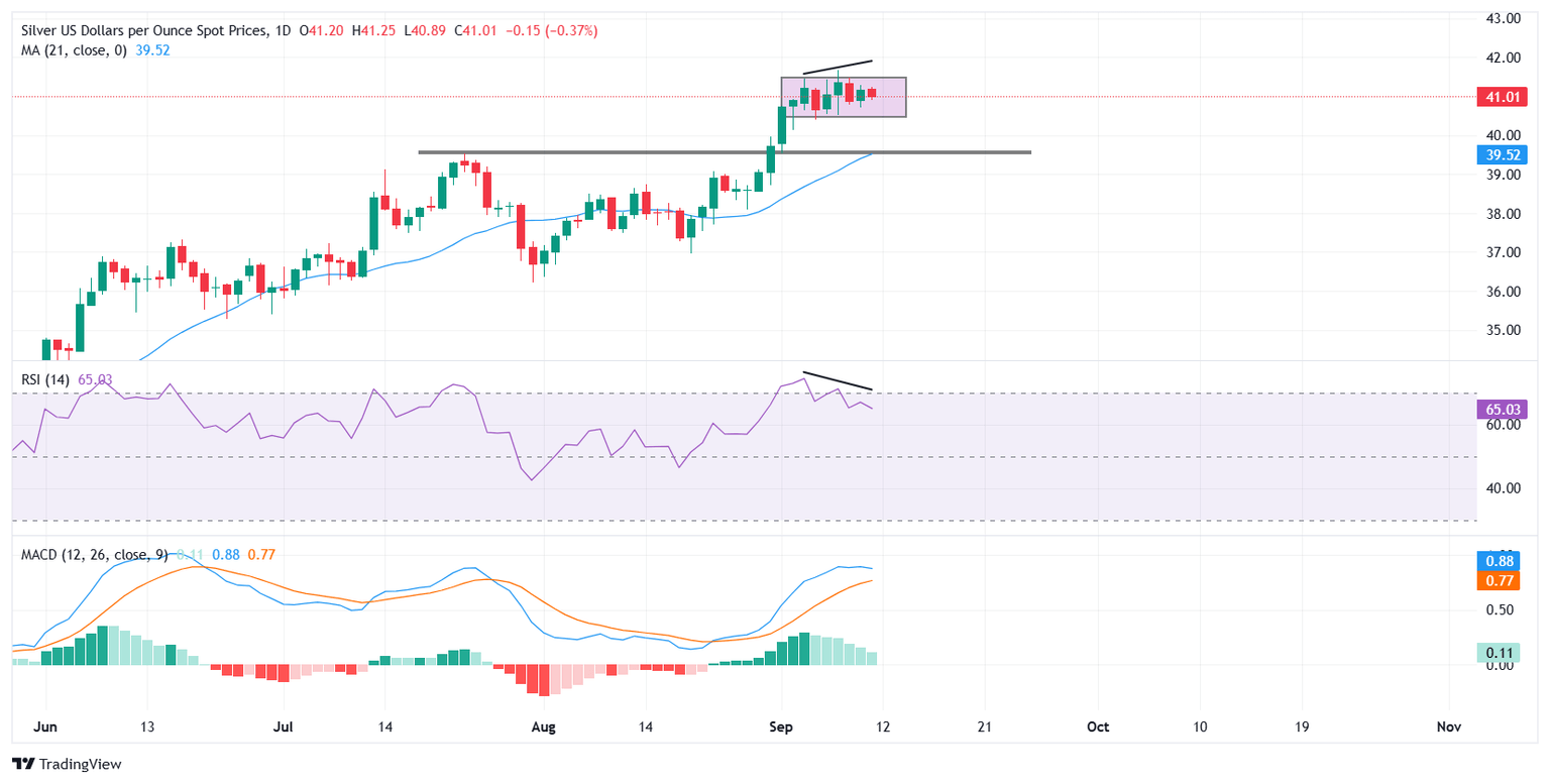 From a technical perspective, Silver has been consolidating within a tight $41.50–$40.50 range since early September. On the daily chart, a bearish divergence on the Relative Strength Index (RSI) points to fading upside momentum, while the flattening Moving Average Convergence Divergence (MACD) histogram signals weakening bullish pressure.