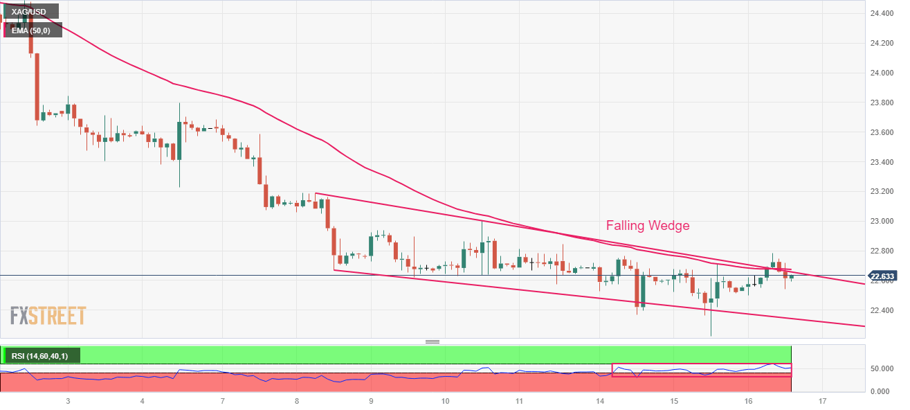 Silver price gathers strength to deliver a breakout of the Falling Wedge chart pattern, which indicates fading downside momentum, formed on a two-hour scale. A breakout of the aforementioned chart pattern will result in a bullish reversal. The 50-period Exponential Moving Average (EMA) at $22.65 continues to act as a barricade for the Silver bulls.
