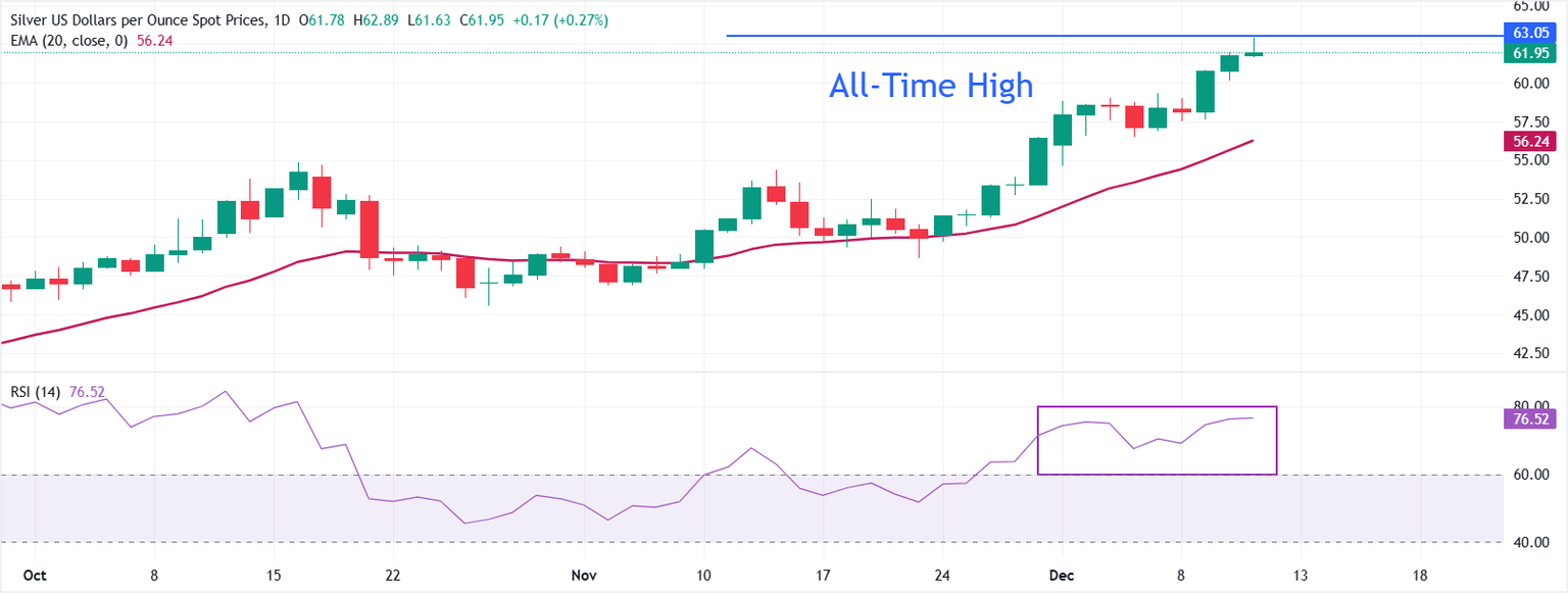 - Silver price retraces to near $62.00 after posting a fresh all-time high around $62.87.