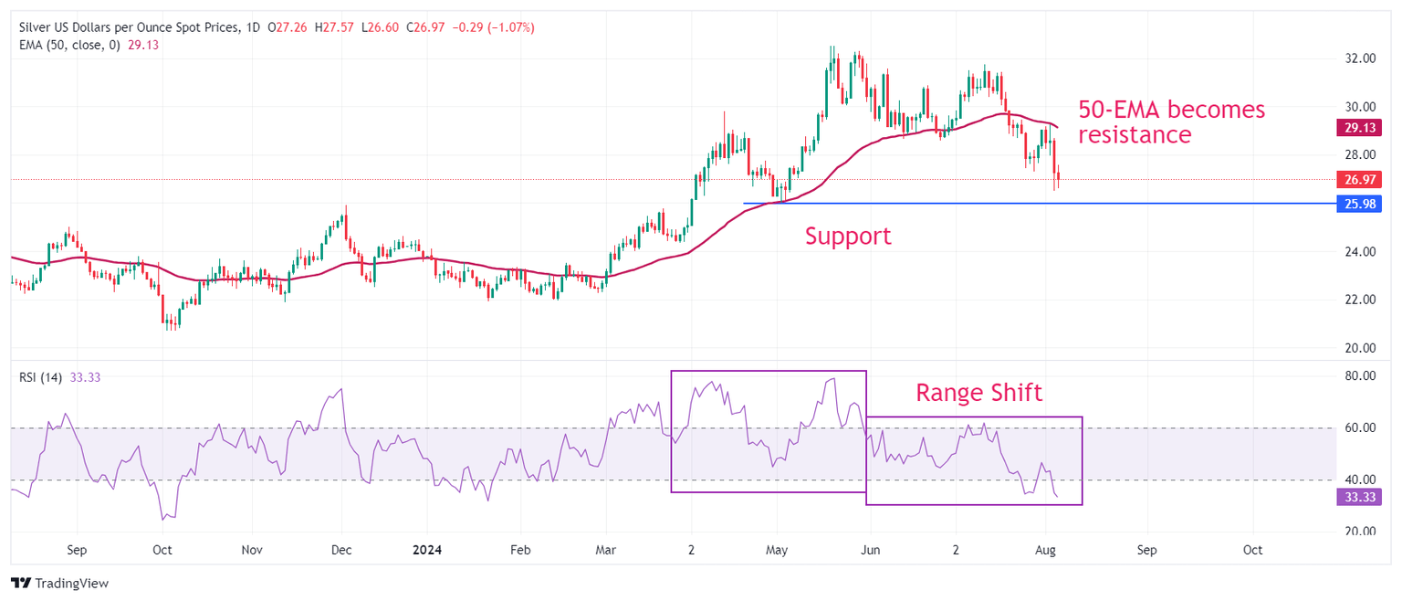 Silver price drops sharply after facing stiff resistance near the 50-day Exponential Moving Average (EMA), which trades around $27.57. The near-term outlook of the Silver price has become bearish as the 14-day Relative Strength Index (RSI) has shifted into the 20.00-60.00 range from the bullish range of 40.00-80.00. The momentum has leaned on the downside and any pullback move will be considered a selling opportunity by the market participants.