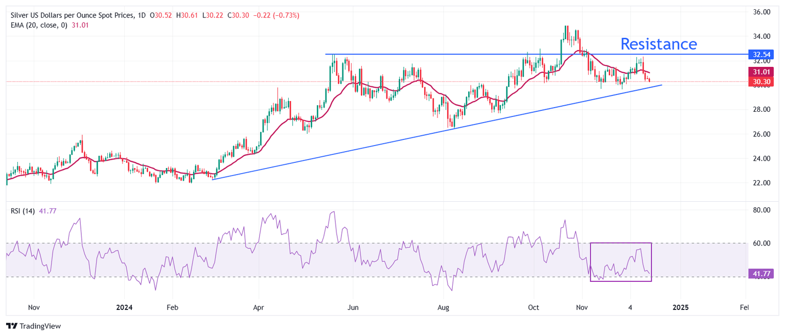 Silver price (XAG/USD) slumps to near $30.30 in Tuesday’s European session. The white metal weakens as bond yields stay firm on expectations that the Federal Reserve (Fed) will signal fewer interest rate reductions in 2025 after reducing key borrowing rates by 25 basis points (bps) to 4.25%-4.50% in the monetary policy meeting on Wednesday.