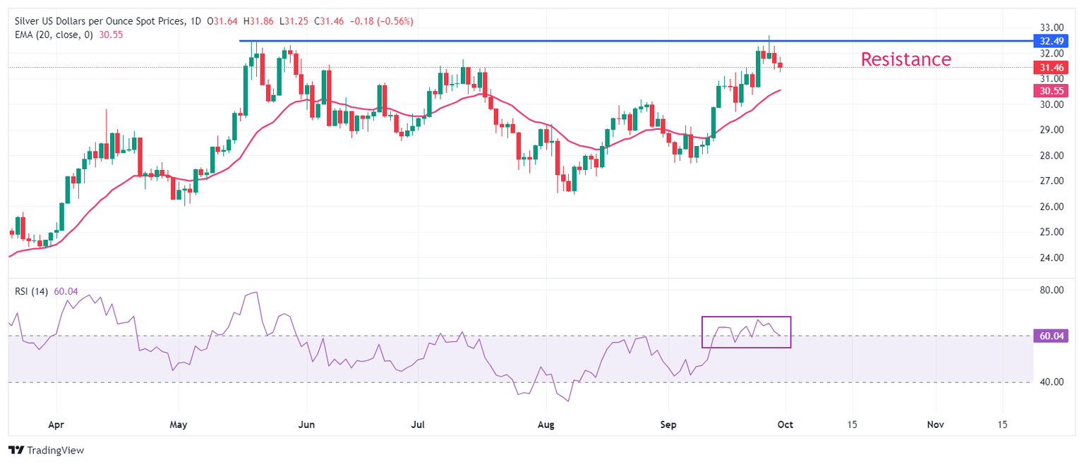 The US Dollar Index (DXY), which tracks the Greenback’s value against six major currencies, appears as vulnerable near 100.20. 10-year US Treasury yields climb to near 3.77%. Higher yields on interest-bearing assets increase the opportunity cost of holding an investment in non-yielding assets, such as Silver.