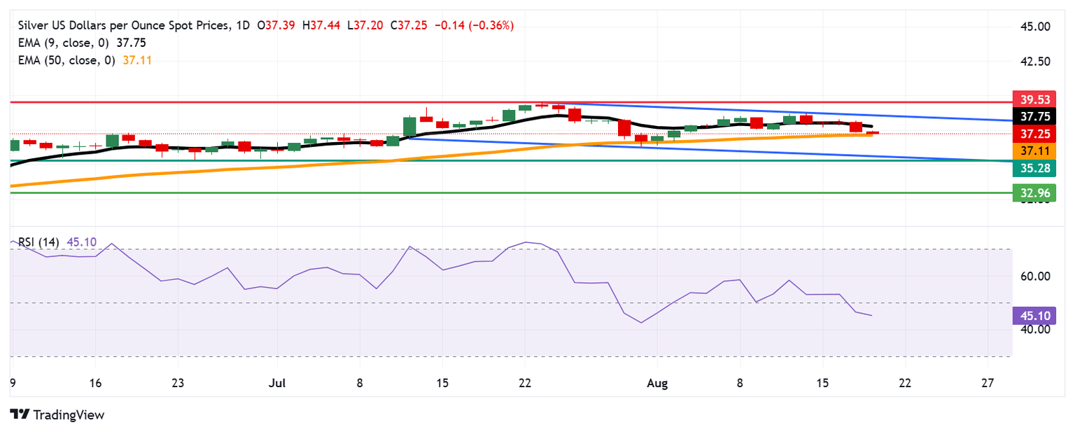 Silver price (XAG/USD) extends its losing streak for the fifth consecutive session, trading around $37.20 per troy ounce during the Asian hours on Wednesday. The technical analysis of the daily chart suggests the price of the precious metal consolidates within a descending channel pattern, indicating a prevailing bearish bias.
