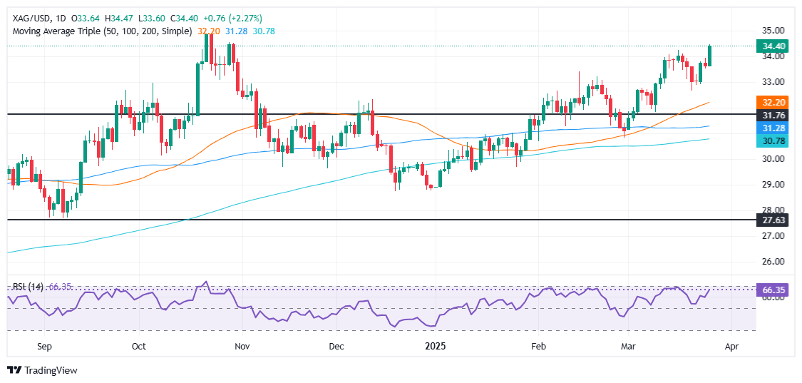 Silver price rallies sharply on Thursday, clears the $34.00 mark as uncertainty about US trade policies, regarding 25% tariffs in all cars, increased appetite for the precious metal. As of writing, the XAG/USD trades at #34.38, up over 2.20%