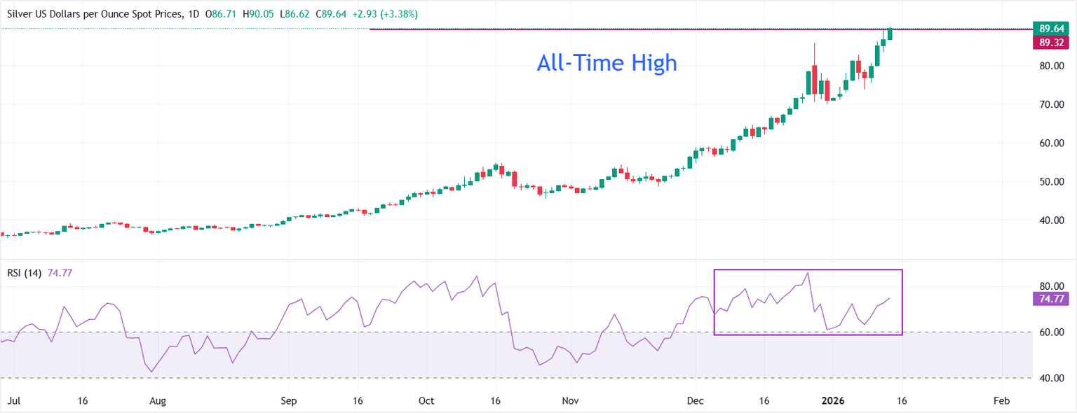 - Silver price posts a fresh all-time high near $90.00 as the US threatens military action in Iran.