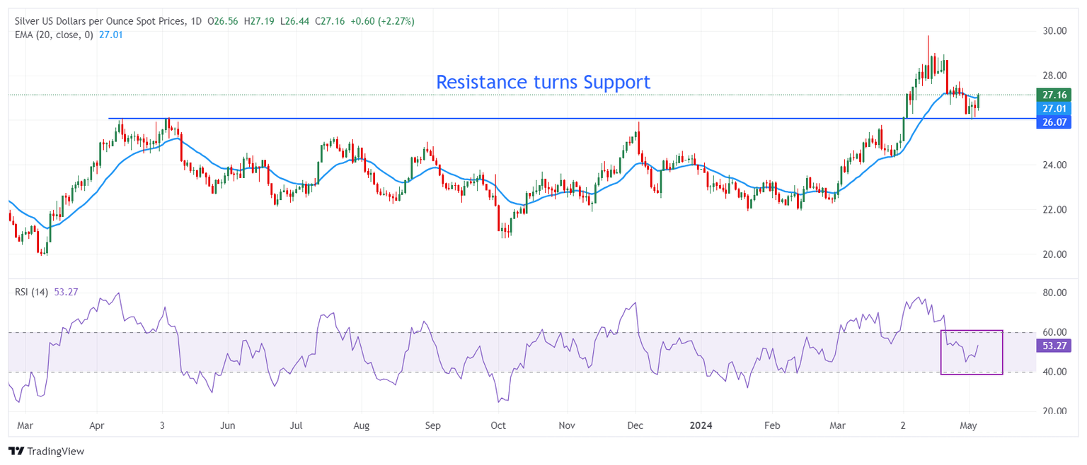 Silver price recovers after discovering strong buying interest near the horizontal support plotted from 14 April 2023 high around $26.09 on a daily timeframe. The above-mentioned support was earlier a major resistance for the Silver price bulls. The uncertainty over Silver’s near-term outlook still remains as it has yet not settled above the 20-period Exponential Moving Average (EMA), which trades around $27.20.
