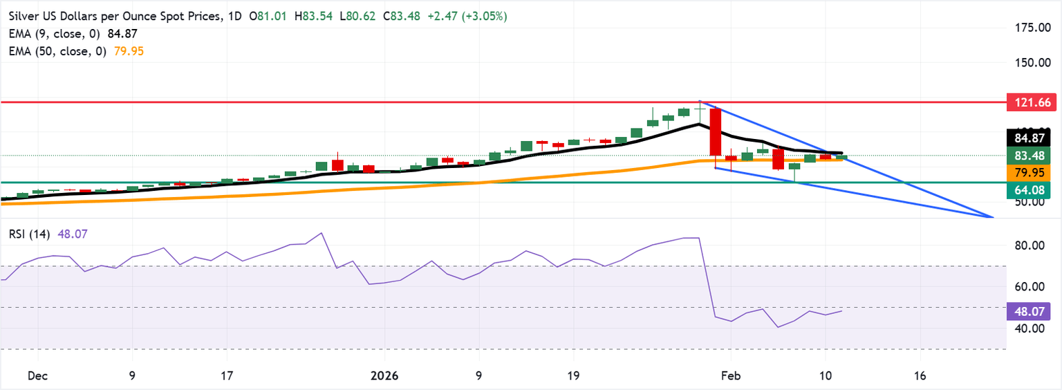 On the upside, the immediate resistance lies at the upper boundary of the descending wedge around $84.50, followed by the nine-day at $84.66. A close back above the short-term average would ease near-term pressure and support the Silver price to explore the region around the all-time high of $121.66, reached on January 29.