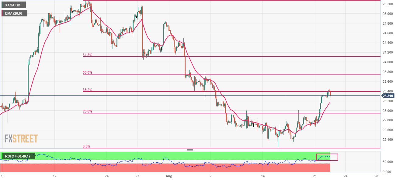 Silver price finds an intermediate resistance after a solid recovery to near the 38.2% Fibonacci retracement (plotted from July 20 high at $25.27 to August 15 low at $22.23) at $23.40. The asset shifts auction above the 20-period Exponential Moving Average (EMA), which trades around $23.20.