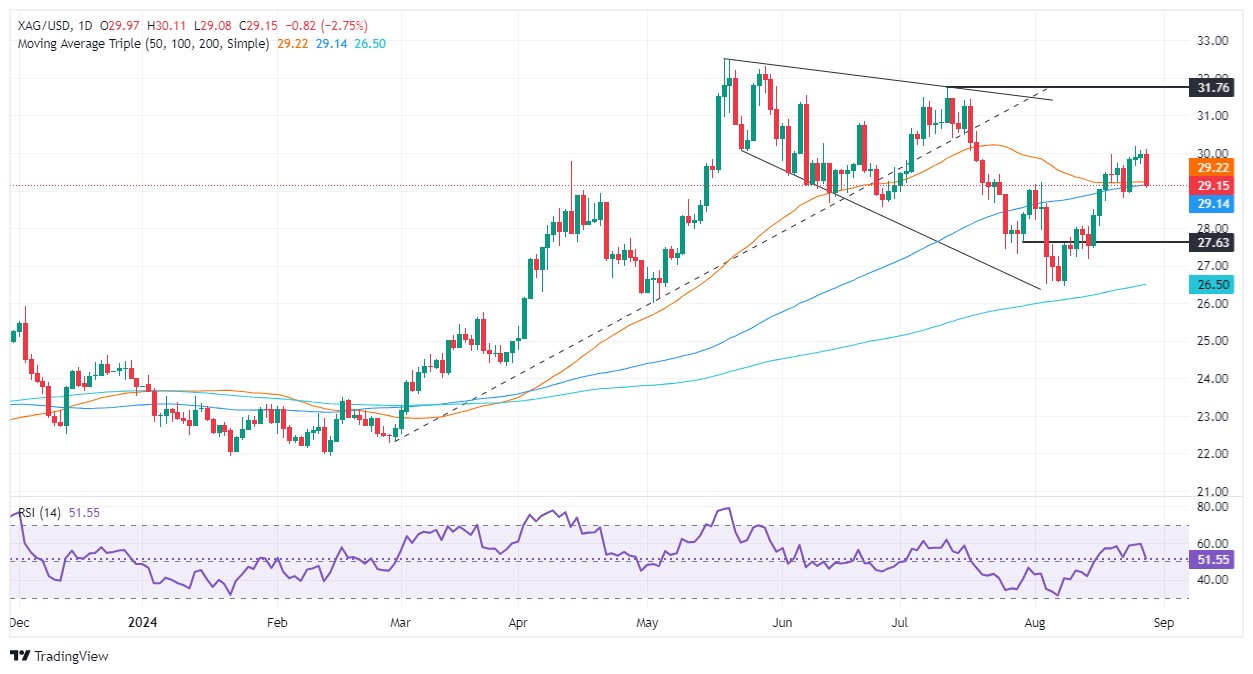 Silver’s uptrend remains in place, but since the XAG/USD rallied from around $26.45 to $30.18, the non-yielding metal has dropped toward the current spot prices, which is also the confluence of the 50 and 100-day moving averages (DMAs) at $29.17-$29.13, respectively.