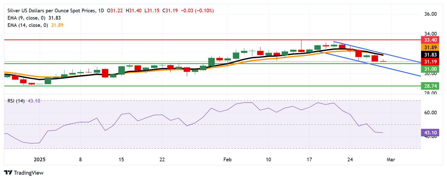 Silver price (XAG/USD) remains steady after registering losses in the previous session, trading near $31.20 per troy ounce during the early European session on Friday. Technical analysis on the daily chart indicates a strengthening bearish outlook, with the grey metal moving downwards within a descending channel pattern.