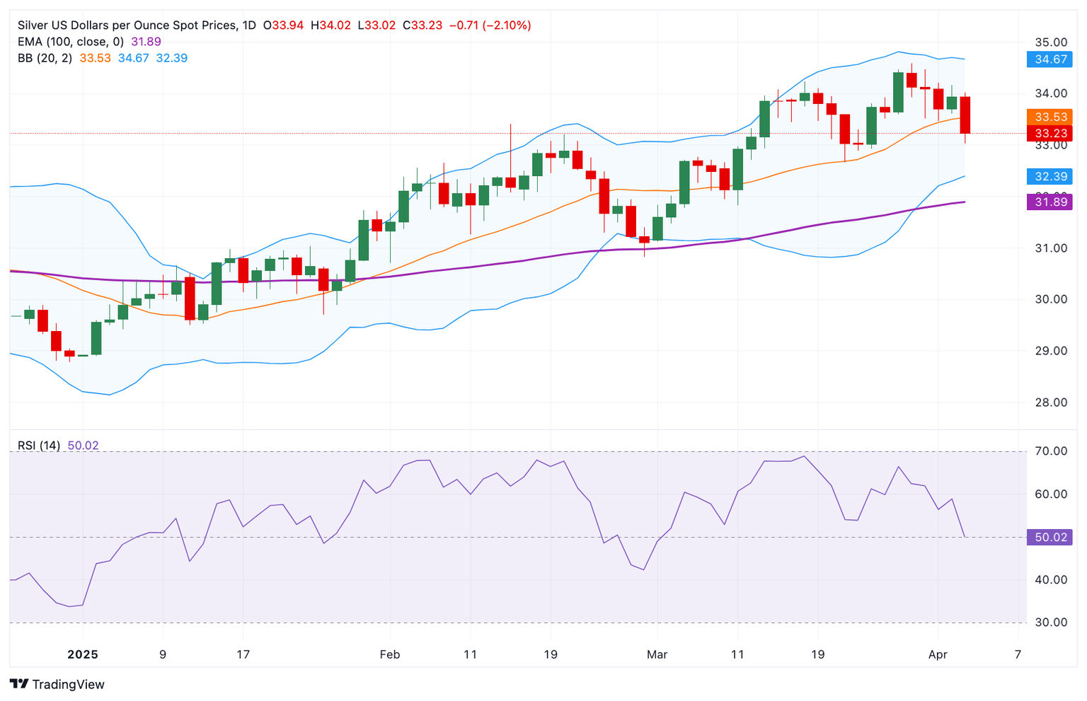 The Silver price (XAG/USD) falls to near $33.15 during the early European session on Thursday, pressured by some profit-taking. Nonetheless, the downside for the white metal might be limited as US President Donald Trump announced sweeping new global tariffs on Wednesday, raising the fears of a widening trade war.