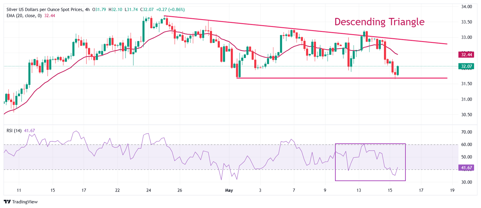 Silver price trades in a Descending Triangle formation on a four-hour timeframe. The chart pattern reflects indecisiveness among market participants. The near-term trend of the white metal is bearish as it trades below the 20-period Exponential Moving Average (EMA), which is around $32.70.