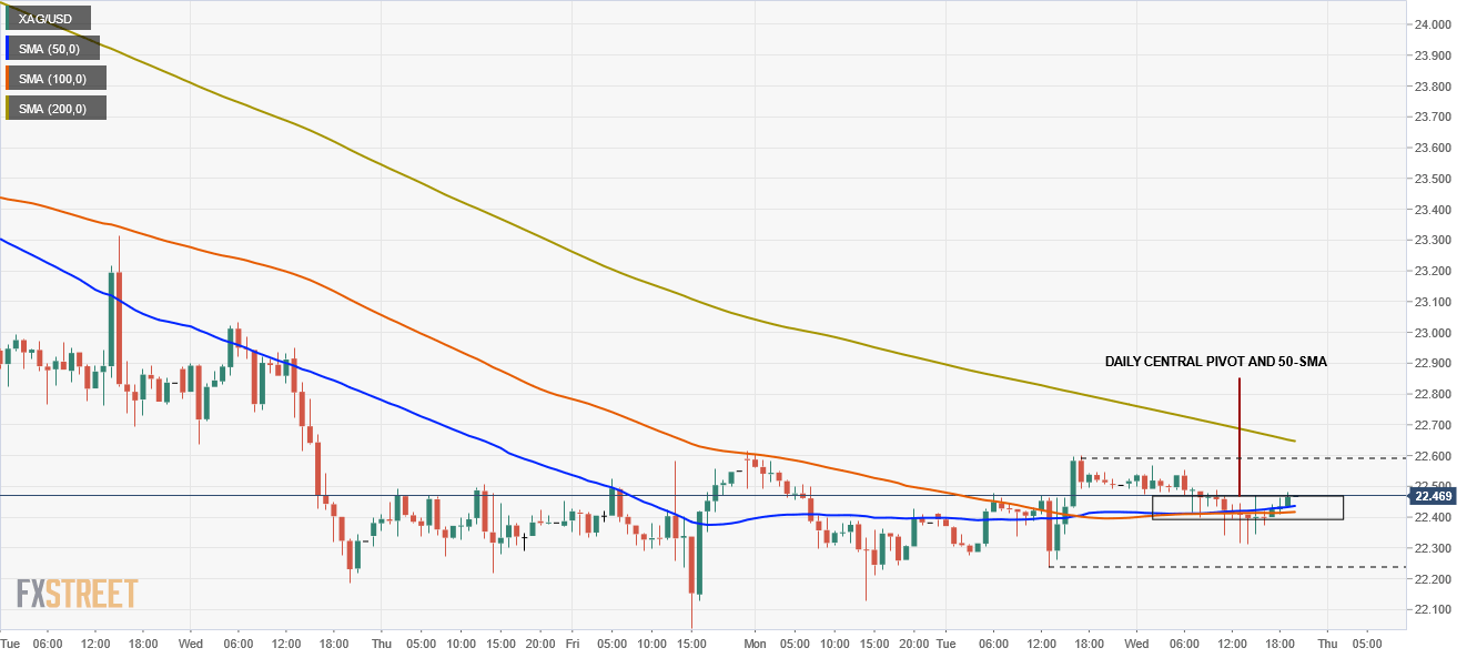 In the overnight session, XAG/USD price action remained subdued, within the $22.29-55 range, but lack of a catalyst might keep the non-yielding metal fluctuating around the hourly 50 and 100-simple moving averages.