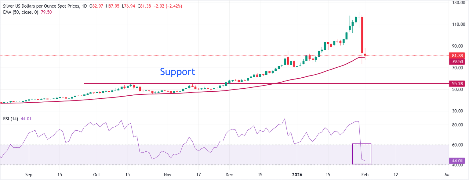 In the daily chart, XAG/USD trades at $81.38. Price holds above the rising 50-day EMA at $79.50, maintaining the medium-term uptrend. The average’s upward slope supports the broader bias. RSI at 44 (neutral) reflects cooled momentum after an overbought stretch. A sustained hold above the average could keep buyers engaged, while a close beneath it would expose downside.