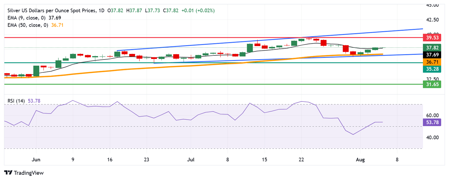 Silver price (XAG/USD) remains steady after registering gains in the previous three successive sessions, trading around $37.80 per troy ounce during the Asian hours on Wednesday. The technical analysis of the daily chart suggests the price of the precious metal moves upwards within an ascending channel pattern, indicating a persistent bullish bias.