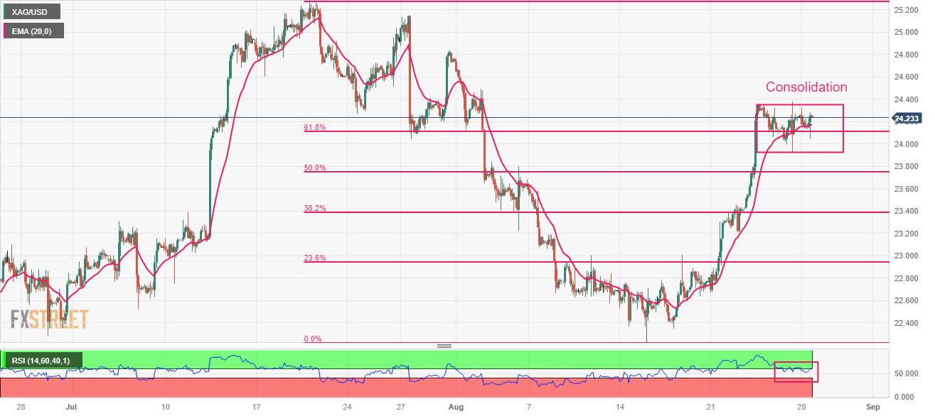 Silver price trades directionless near the 61.8% Fibonacci retracement (plotted from July 20 high at $25.27 to August 15 low at $22.23) at $24.12 on a two-hour scale. Upward-sloping 20-period Exponential Moving Average (EMA) at $24.17 is providing support to the Silver bulls.