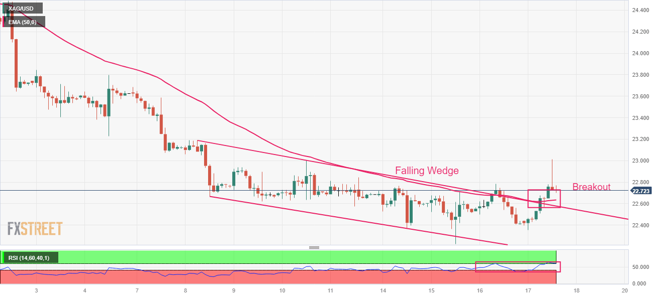 Silver price delivers a breakout of the Falling Wedge chart pattern formed on an hourly scale. A breakout of the aforementioned chart pattern results in a bullish reversal. Silver price climbs above the 50-period Exponential Moving Average (EMA) around $22.63.