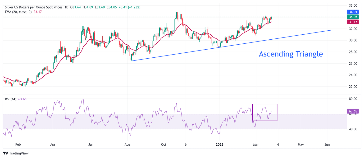 Silver price (XAG/USD) advances to near $34.00 during European trading hours on Thursday. The white metal strengthens as fresh 25% tariffs on cars entering the United States (US) have stoked fears of global economic uncertainty.