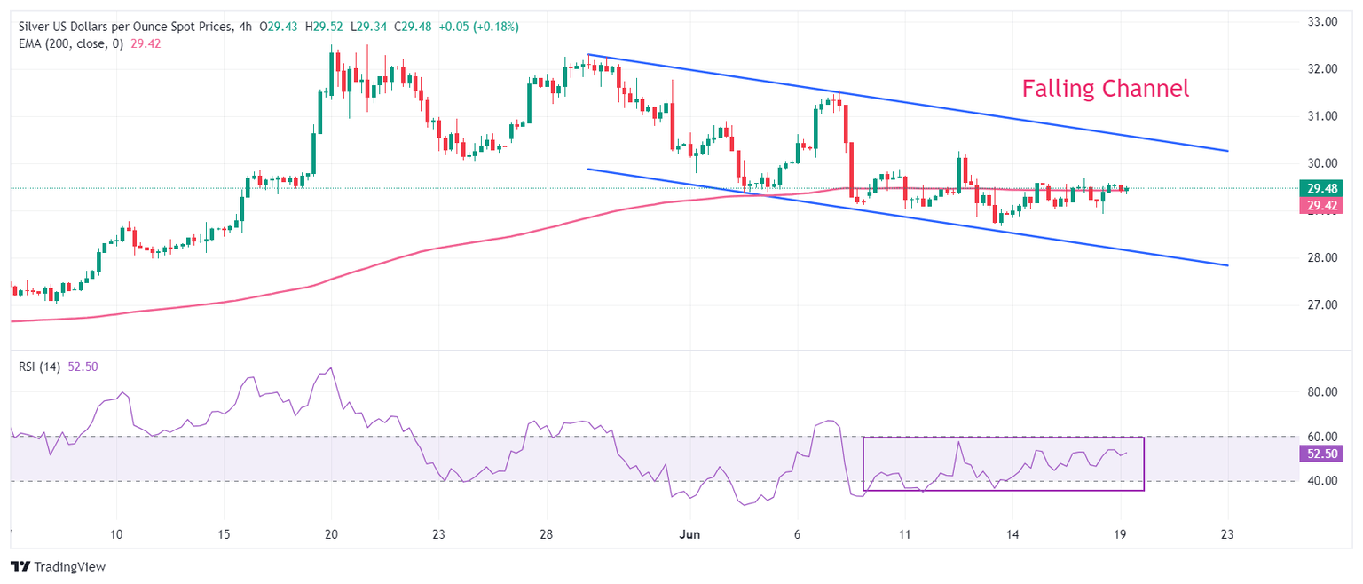Silver price oscillates in a Falling Channel chart pattern, on a four-hour timeframe, in which each pullback is considered as selling opportunity by market participants. The asset hovers near the 200-period Exponential Moving Average (EMA), which trades around $29.40, indicating indecisiveness among market participants.