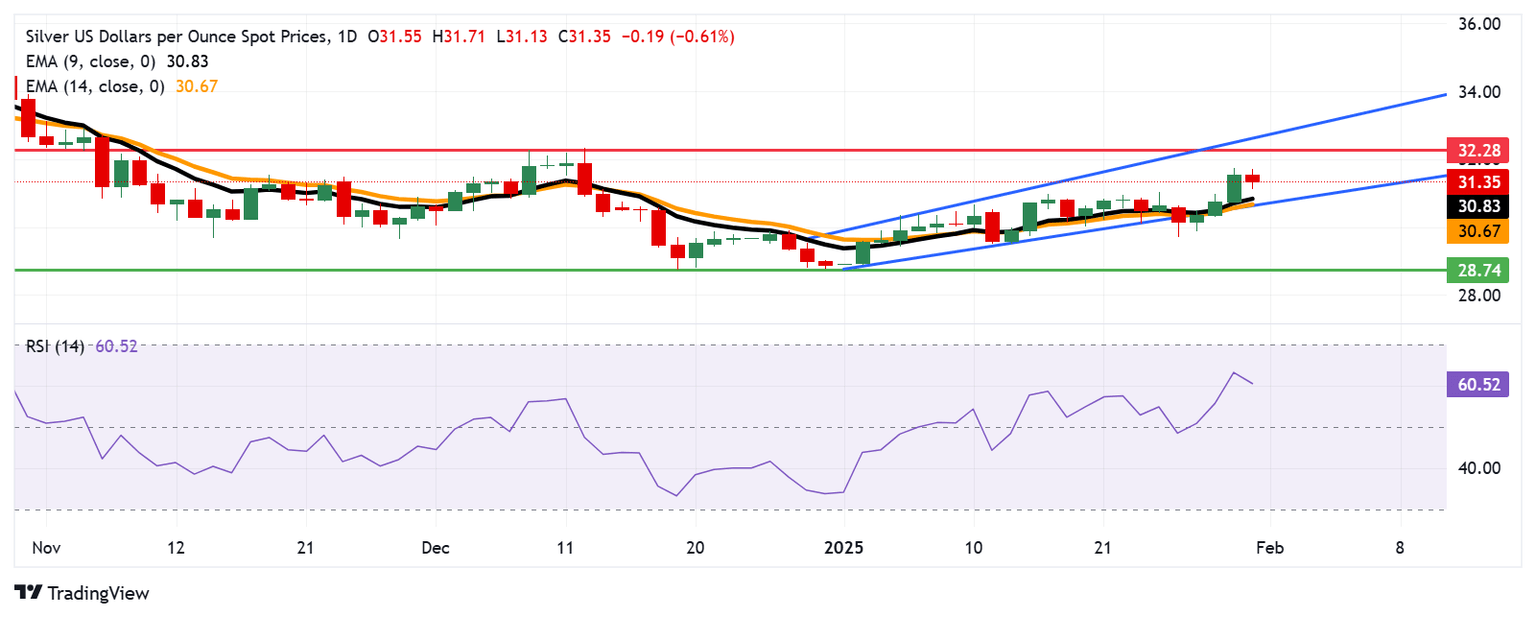Silver price (XAG/USD) halts its three-day winning streak, trading around $31.30 per troy ounce during Asian hours on Friday. A daily chart analysis suggests a persistent bullish bias for the precious metal, as its price continues to rise within an ascending channel pattern.