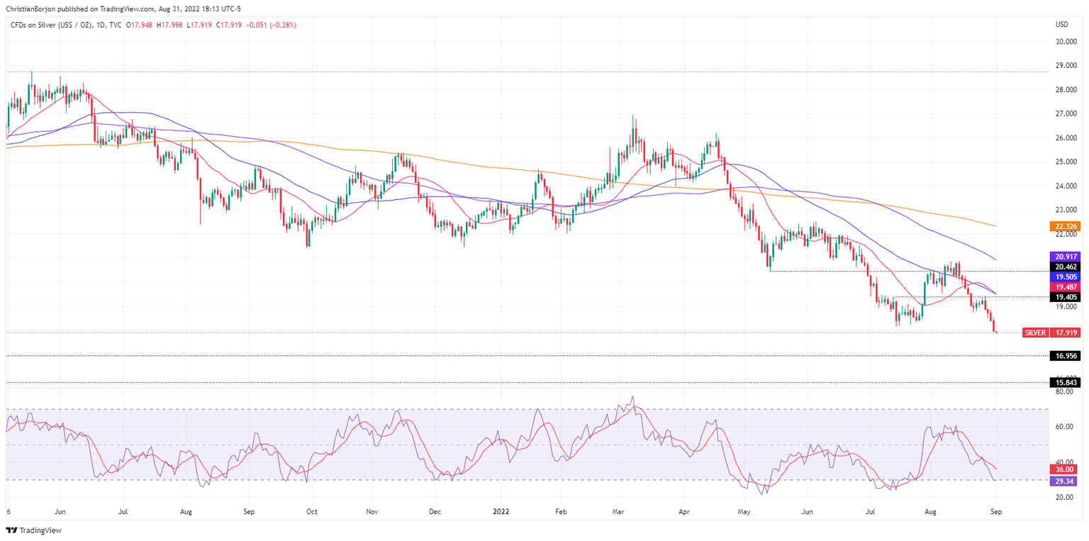 Silver price tanks sharply for four straight days, reaching a new year-to-date (YTD) low below the $18.00 figure, levels not seen since July 2020. XAG/USD is trading at $17.96 as the Asian Pacific session begins, almost flat after dropping 2.33%, hitting a two-year low of $17.91 on Wednesday.