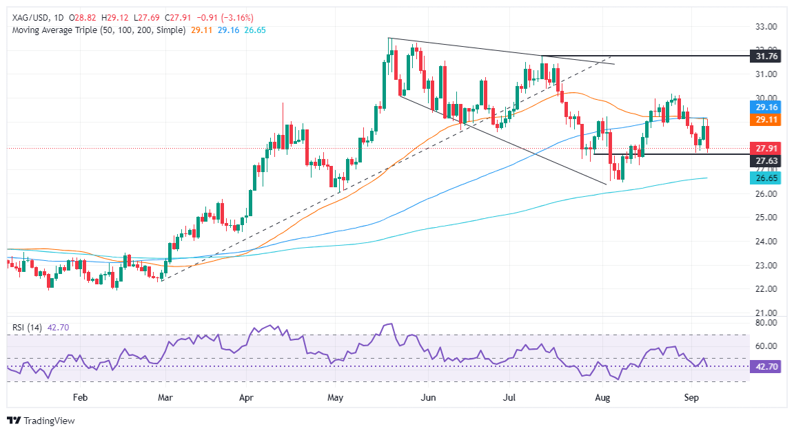The Silver price plunged late in the North American session, down over 3%, and traded at $27.89 after reaching a high of $29.11. Market sentiment turned risk-averse to precious metals, while the Greenback gathered some traction amid falling US yields.