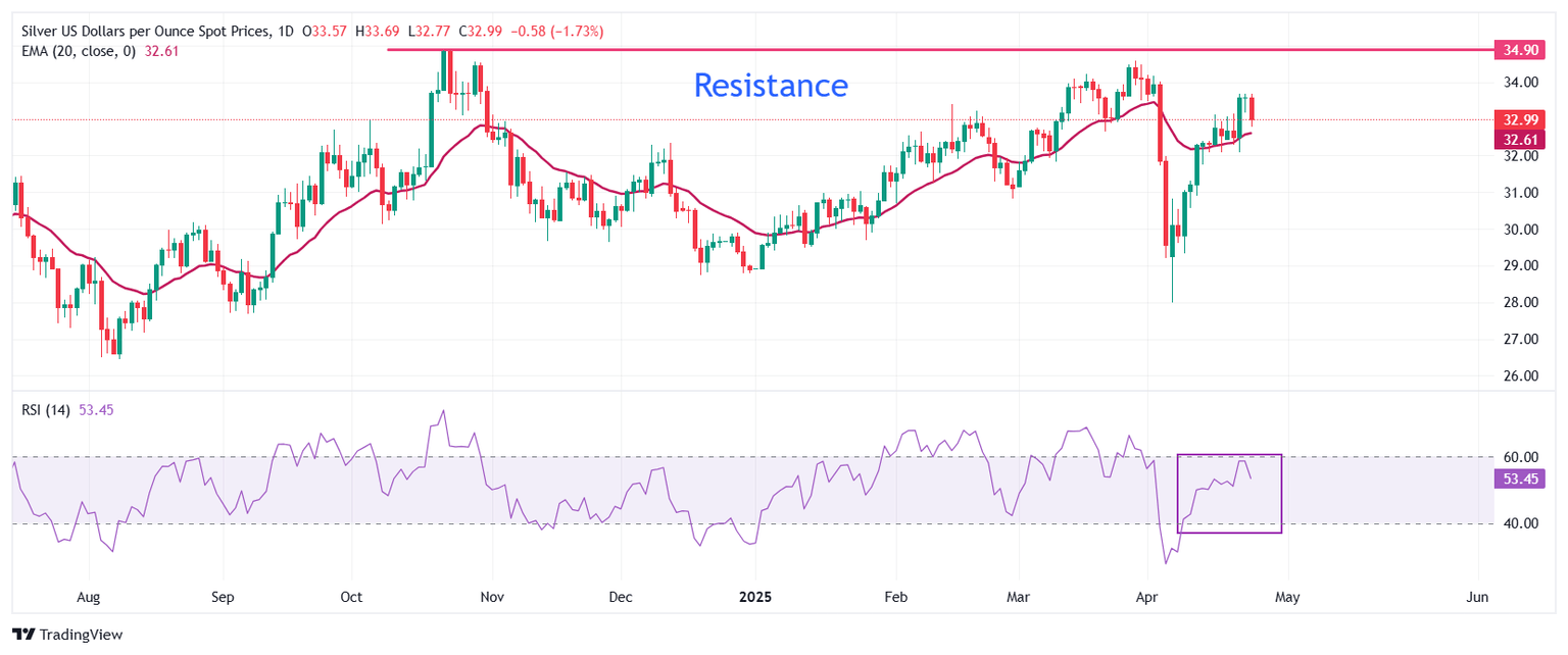 Silver price falls sharply after posting a fresh three-week high around $33.70. However, the near-term outlook of the white metal remains bullish as it holds the 20-day Exponential Moving Average (EMA), which trades around $32.60.