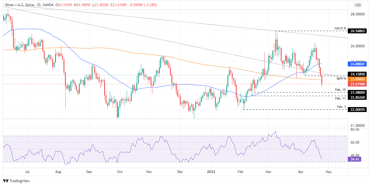 On Monday, the XAG/USD daily chart shows that the price action broke below the 200-day moving average (DMA) at $23.85. However, a daily close below the latter is required to further cement that the bias shifted from upwards to neutral. Furthermore, it’s worth noting that the Relative Strength Index (RSI) is aiming downwards, at 34.41, but it has some room to spare if Silver extends its losses.