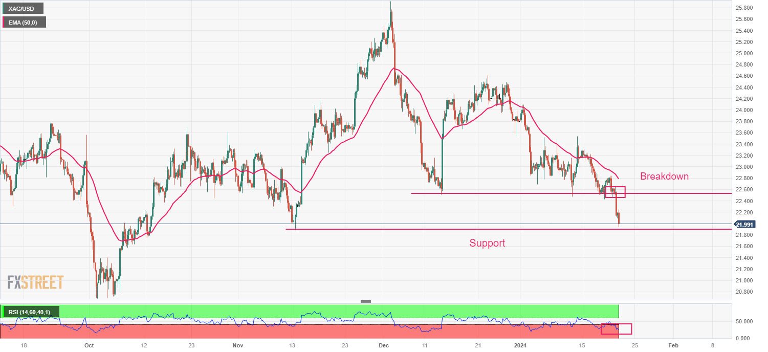Silver price witnesses an intense sell-off after delivering a breakdown of the horizontal support plotted from December 13 low at $22.51. The asset is expected to find an interim support near November 13 low at $21.88. The 50-period Exponential Moving Average (EMA) near $22.80 continues to act as a barricade for the Silver price bulls.