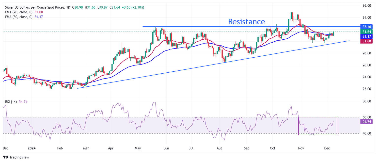 Silver price rallies to near $31.60 after breaking above the three-day resistance of $31.30. The asset climbs above the 20- and 50-day Exponential Moving Averages (EMAs) near $31.10 and $31.20, respectively, suggesting a strong uptrend.