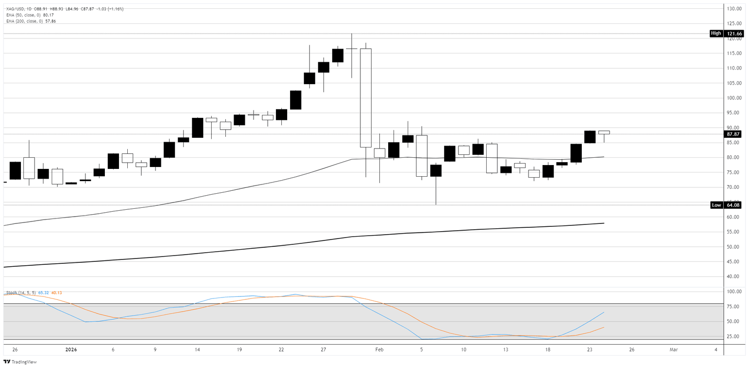 - President Trump's 15% global tariff announcement triggered a sharp safe-haven bid on Monday, with Silver surging over 6% in a single session before profit-taking set in.