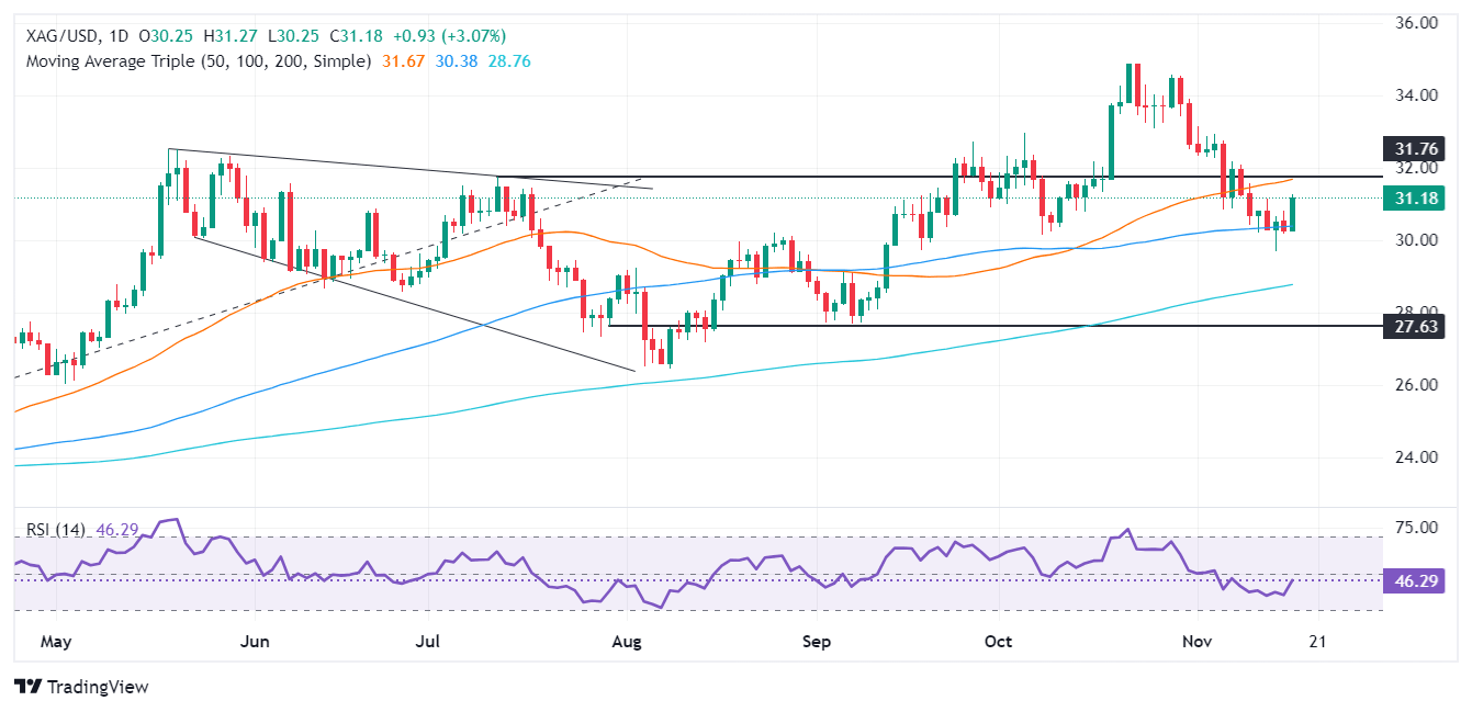 - Technical outlook shows silver below the 50-day SMA at $31.54, with potential resistance at $32.00 and $32.95.