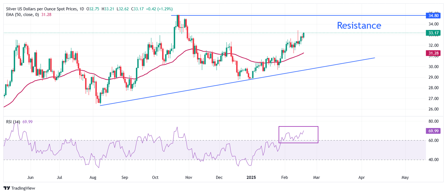 Silver price is inch far from revisiting an over three-month high of $33.40, which it posted on February 14. The outlook of the white metal is bullish as the 50-day Exponential Moving Average (EMA) has been sloping higher, which trades around $31.28.