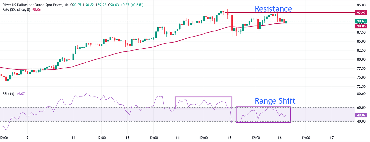 Silver price (XAG/USD) trades over 2% lower to near $90.40 during the Asian trading session on Friday. The white metal struggles to extend its rally after posting a fresh all-time high near $93.90 on Wednesday.