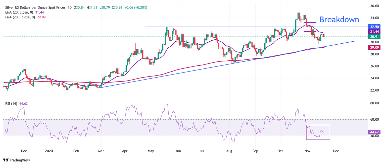 The outlook of the Silver price remains uncertain as investors doubt whether the Federal Reserve (Fed) will cut interest rates again in the December meeting. The probability of the Fed to cut interest rates by 25 bps to 4.25%-4.50% in December has come down to 56% from 72% a week ago, according to the CME FedWatch tool.