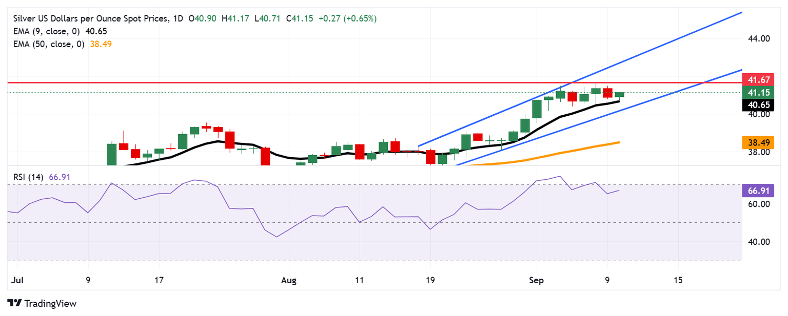 Silver price (XAG/USD) recovers its recent losses from the previous session, trading around $41.10 per troy ounce during the early European hours on Wednesday. The technical analysis of the daily chart suggests the price of the precious metal moves sideways within an ascending channel pattern, indicating that market bias remains bullish.