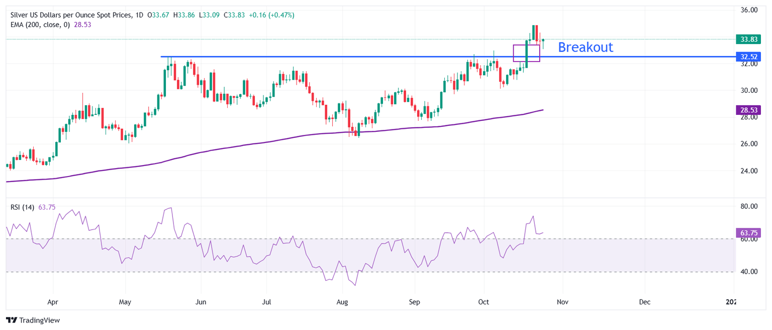 Silver price bounces back from 33.00 in North American trading hours on Friday. The white metal aims to revisit a fresh over 12-year high near $35.00. The asset strengthened after breaking above the horizontal resistance plotted from May 21 high of $32.50 on a daily timeframe, which will act as a support for now. Upward-sloping 20- and 50-day Exponential Moving Averages (EMAs) near $32.30 and $31.10, respectively, signal more upside ahead.