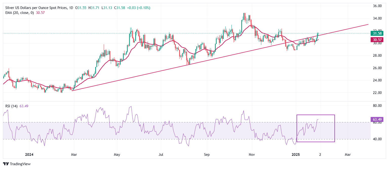 Silver price strengthens on a decisive break above the upward-sloping trendline around $30.85, which is plotted from the 29 February 2024 low of $22.30 on a daily timeframe. The near-term outlook of the white metal remains firm as it holds the 20-day Exponential Moving Average (EMA), which trades around $30.57.