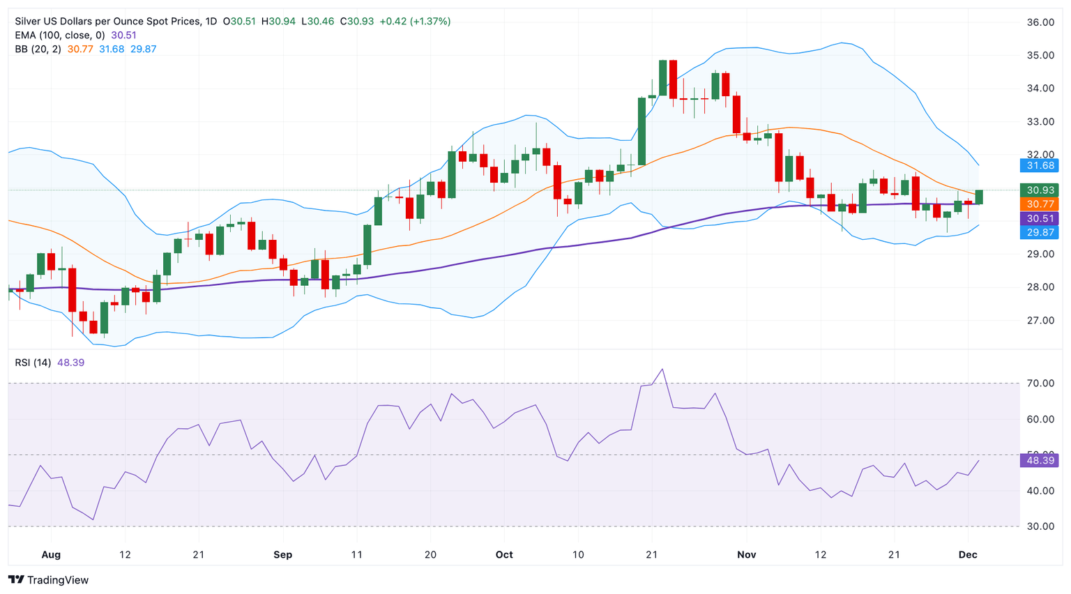 The immediate resistance level for XAG/USD emerges near the upper boundary of the Bollinger Band of $31.68. Any follow-through buying above this level could pave the way to the $32.90-$33.00 zone, representing the psychological level and the high of November 5. The additional upside filter to watch is $34.55, the high of October 29.