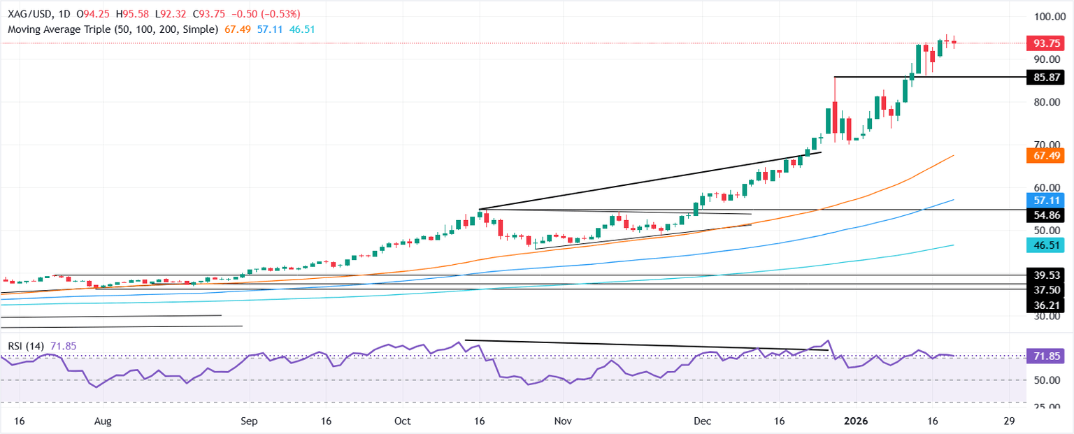 Silver price (XAG/USD) retreats on Wednesday after reaching a daily high of $95.56 after US President Donald Trump eased his tone in his Davos speech, saying that he is ready to negotiate Greenland with Denmark. At the time of writing, XAG/USD trades at $93.57, down over 1% after reaching a record high of $95.89 on Tuesday.