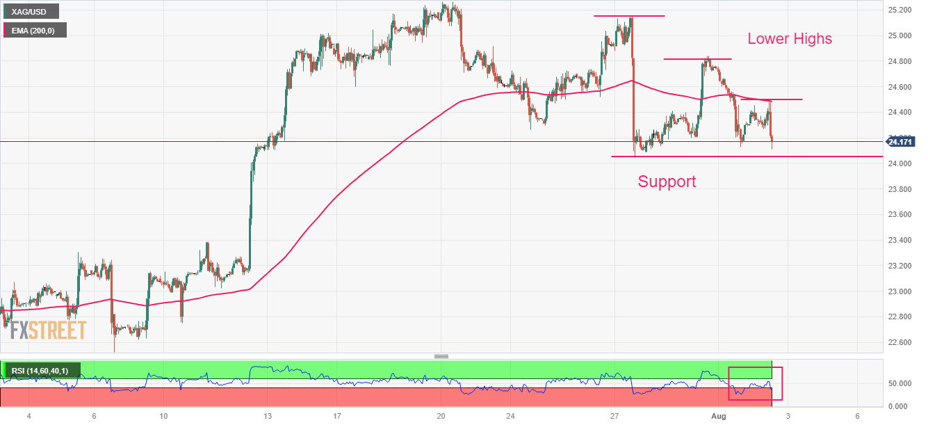 Silver price is maintaining a lower high formation on an hourly scale, which indicates that investors are capitalizing pullbacks as selling opportunities. The asset could deliver further downside if it drops below the horizontal support plotted from July 27 low around $24.00.
