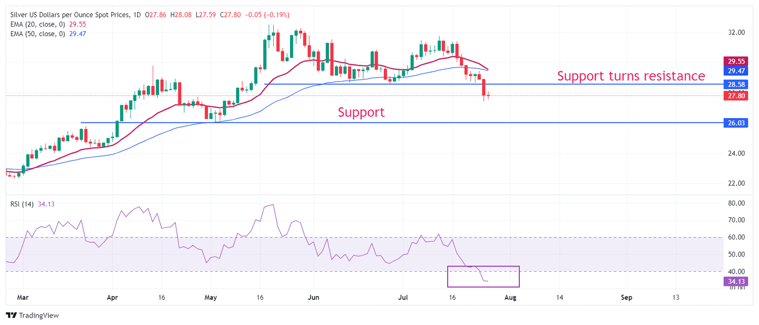 Silver price (XAG/USD) falls back after a short-lived pullback move to near $28.00 in Friday’s European session. The white metal remains in the bearish trajectory amid uncertainty over its demand as an industry metal globally.