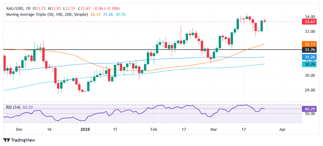 Conversely, if XAG/USD slips beneath $33.00, immediate support emerges at the March 21 low of $32.66. Once hurdled, the next stop is the 50-day Simple Moving Average (SMA) at $32.04.