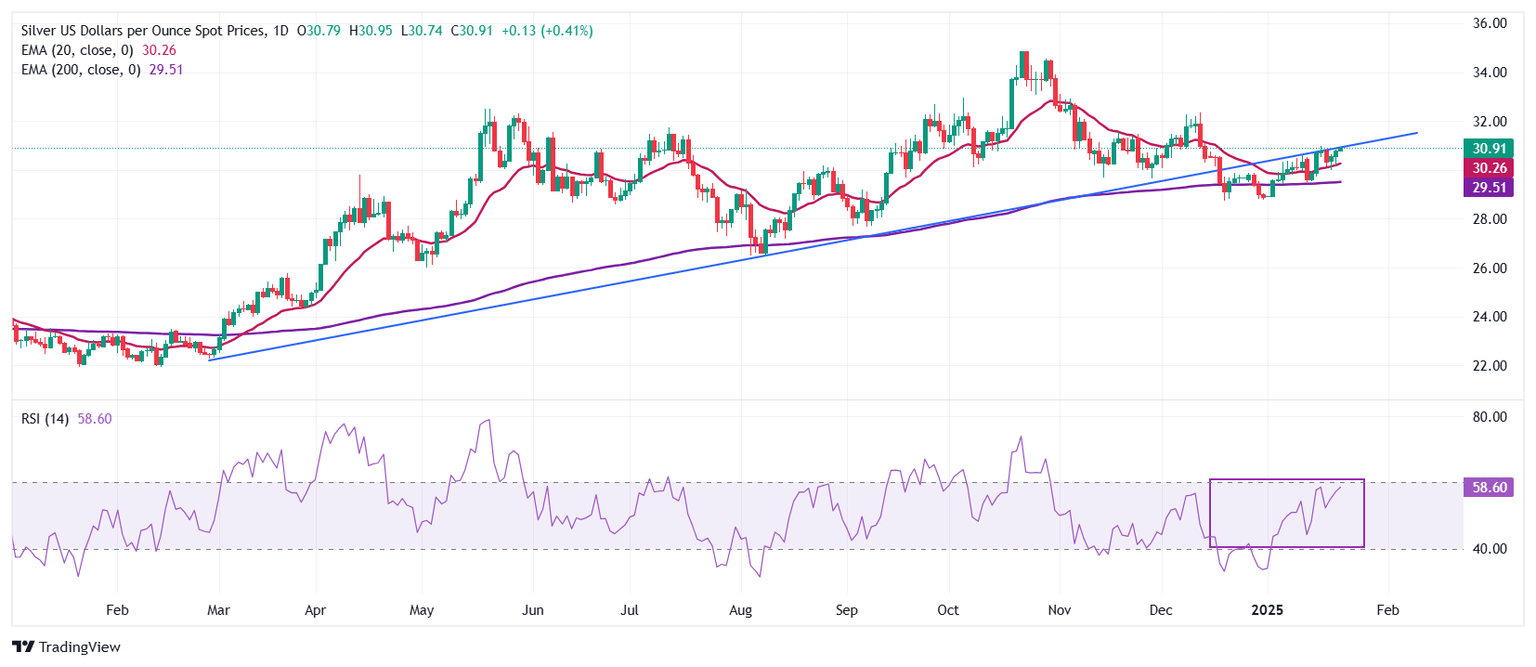 Silver price (XAG/USD) reclaims a more-than-a-month high of $30.95 in Wednesday’s European session. The white metal strengthens as the US Dollar (USD) extends its downside due to less-fearful tariff plans announced by United States (US) President Donald Trump in his first two days of administration.