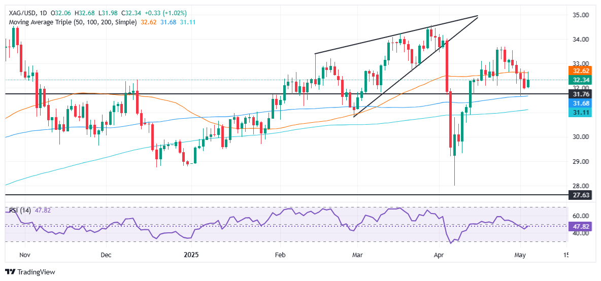 The Relative Strength Index (RSI) shows that momentum favors sellers as the RSI turned bearish on May 1, and XAG/USD slipped through the 50-day Simple Moving Average (SMA) at $32.61.