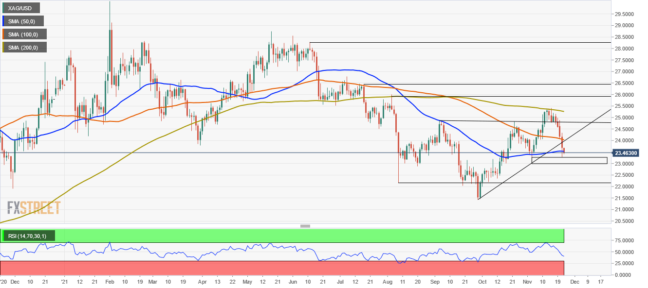 Silver (XAG/USD) edges lower during the New York session, down 0.80%, trading at $23.47 at the time of writing. The market sentiment is downbeat and has been like that since Monday when US President Joe Biden renominated Jerome Powell to the Fed for a second four-year period. That benefitted the greenback, with the US Dollar Index closing to the 97.00 figure, sitting at 96.89, up some 0.42%.
