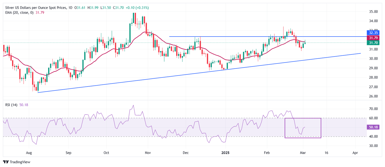 Silver price moves higher but struggles to extend its upside above the 20-day Exponential Moving Average (EMA), which trades around $31.80.