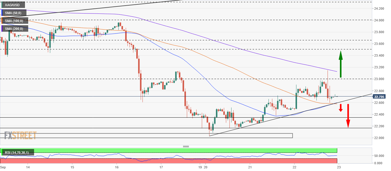 XAG/USD is trading above the short-term time frame simple moving averages (SMA’s) at $22.69. For the bulls to resume the upward pressure, they will need to reclaim $23.00. In case of a breach of that level, the next supply zone would be the September 22 high at $23.12. A decisive break of the latter would expose $23.50.