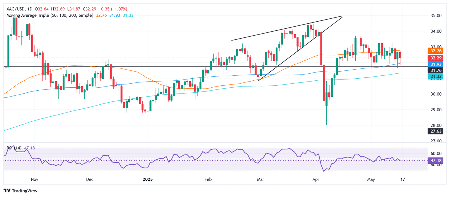 - XAG/USD capped at $32.73 (50-day SMA), supported by 100-day SMA near $31.88 amid choppy trade.